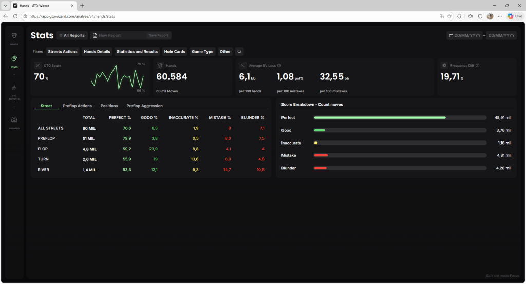 Más de 60.000 manos analizadas, en GTO Wizard, de torneos durante este año, los números reflejan algunos datos relevantes, hay buenas decisiones sobre todo preflop, hay errores y hay margen claro de mejora, especialmente en turn y river, donde se concentra gran parte del EV perdido. Nada sorprendente y nada que no se pueda trabajar.